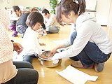 子どもたちは、恒例の大学生による「絵本のよみきかせ」のほかに、小麦粉ねんどでも遊びました。お母さんたちは、楽しくおしゃべりしながら、アロマオイルを使って入浴剤(バスボム)を作りました。今晩は、子どもたちと良い香りのバスタイムを楽しみます!