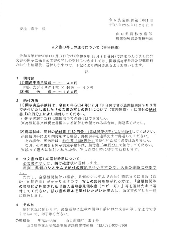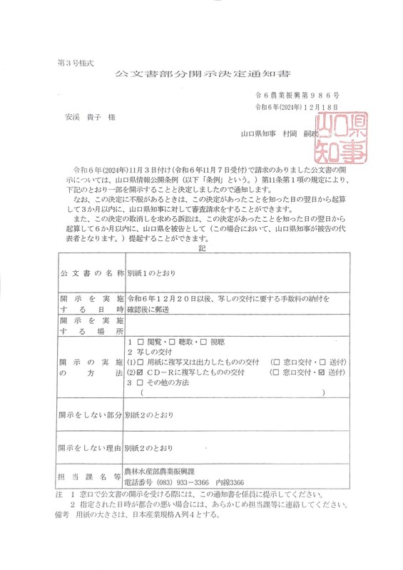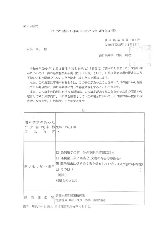 山口県情報公開条例にそって、2024年11月に情報公開請求をいたしました。