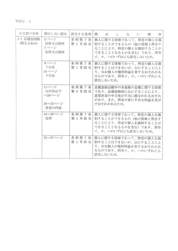 また、「品種登録出願中の未登録の品種に関する情報であり、品種登録前に公にすることにより、意思決定の中立性が不当に損われる恐れがあり、また、特定のものに不当な利益を及ぼす恐れがあるため。」出願品種の育成方法や育成経過、繁殖方法、品種の形質特性、栽培状況、写真なども開示してありません。