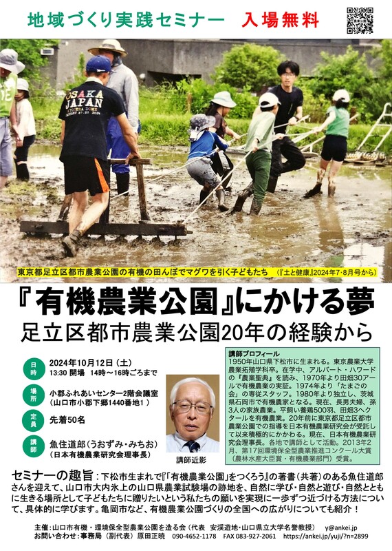 セミナーの趣旨:下松市生まれで『「有機農業公園」をつくろう』の著書(共著)のある魚住道郎さんを迎えて、山口市大内氷上の山口県農業試験場の跡地を、自然に学び・自然と遊び・自然とともに生きる場所として子どもたちに贈りたいという私たちの願いを実現に一歩ずつ近づける方法について、具体的に学びます。亀岡市など、有機農業公園づくりの全国への広がりについても紹介!