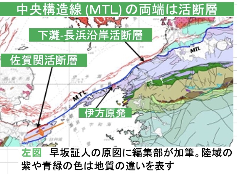 みけこ これに異を唱えているのが小松証人と早坂証人です。原発沖600mにある中央構造線が活断層の主断層であり、8㎞沖にあるのは従属する活断層帯だと主張しています