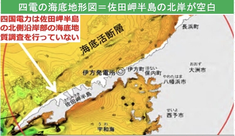 くみこ 四電作成の右図は、灰色部分が四国の陸域、黄色が海域ですが、佐田岬半島北岸と海の間に白い部分がかなりあります(印刷すると見えにくい。ご容赦を)。ここについて芦田証人は「沿岸から約100mは全くデータがない空白部だ」と言います