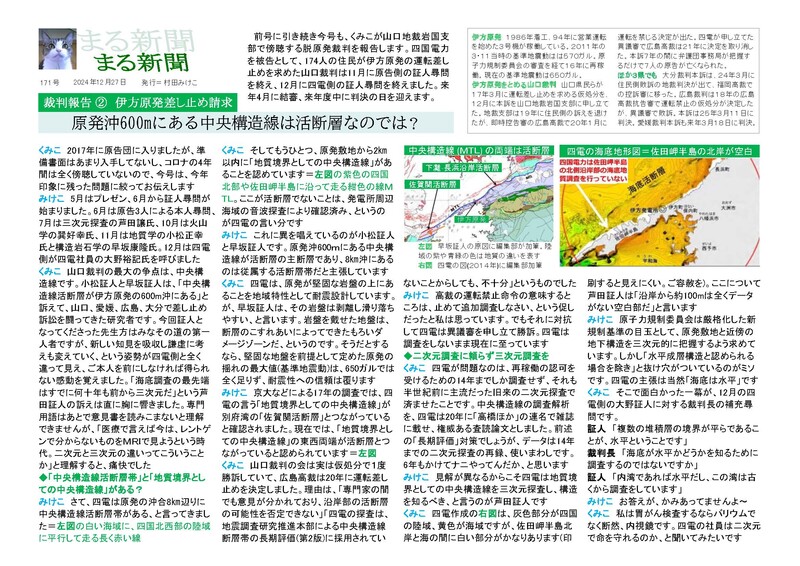 ...ら裁判の話なのにどうし-写真左がまるこ:、右170号2頁 発行=村田みけこ: 2024年12月6日 まる新聞1ページからつづく1頁で「F-D断層」がキーワードだと主張したみけこですが、中電が祝島島民の...