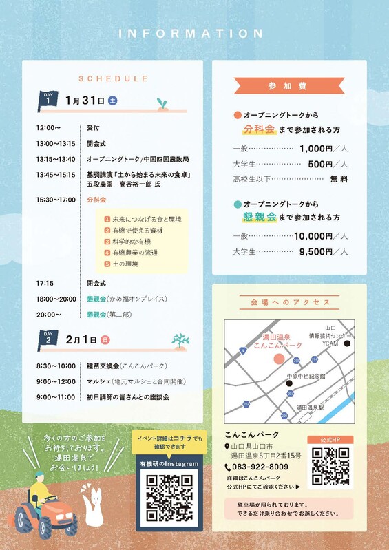 問合せ先山口県有機農業研究会 事務局 尾兼(おがね) 083-929-0416 メール ogane◎akikawabokuen.co.jp (◎を@にして送信)