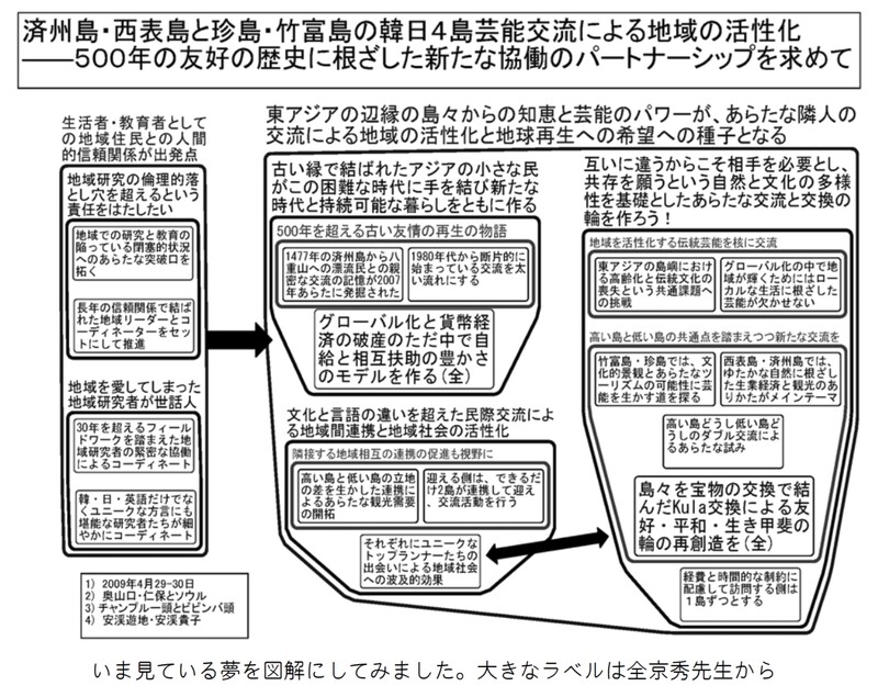 その後は、西表島やアフリカの論文を書いていて先が見えなくなった時、屋久島につどった若者たちと地域課題の解決策を考える時など、ここ一番という時に、KJ法がその威力を発揮する場面に出会います。今は、韓国ソウル大学校の全京秀(チョンギョンス)先生と知り合って、新しい国際プロジェクトの夢を育てているところです。そんな異質の交流の場面では、やはりKJ法での意思疎通が有効なようです。(筆者のURL https//ankei.jp)