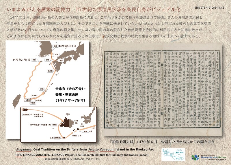 このたび作成したLINKAGE Artbook03の内容を紹介する。1477年2月、朝鮮済州島の人びとが与那国島に漂着し、2年余りをかけて島々を護送されて帰国。3人の漂流民と5か月半をともに過ごした与那国島の人びとは、そのできごとを詳細に伝承していた。《ふがぬとぅ》(他所人)と呼ばれた彼らとの異文化交流と学びあいの日々についての口頭伝承を、最後の伝承者がビジュアル化した画文集。サンゴの育つ南の島の限られた自然資源を持続的に利用してきた知恵の数々が形成された歴史を雄弁に物語るこの伝承は、気候変動と戦争の時代を生きる地球人の未来への指針である。